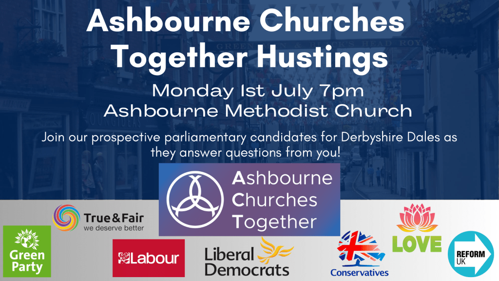 Join us for our Ashbourne Churches Together hustings where we get to meet our 7 prospective parliamentary candidates. The event will be held at Ashbourne Methodist Church at 7pm. There will also be a live stream available for those who are unable to attend in person – more details of this will be released soon.
